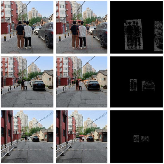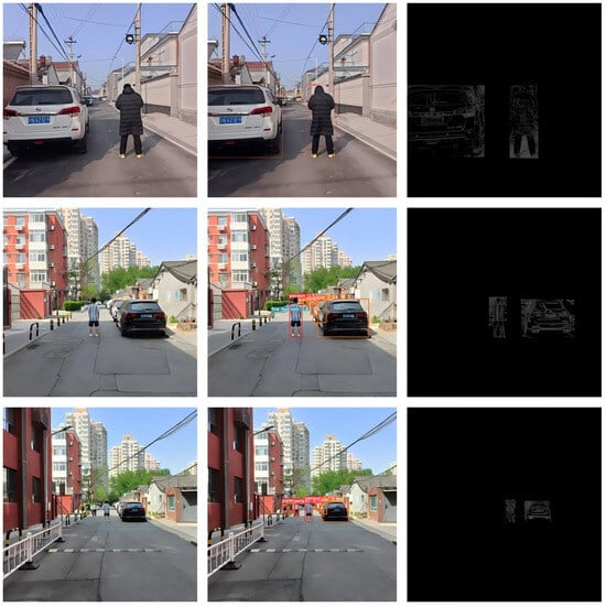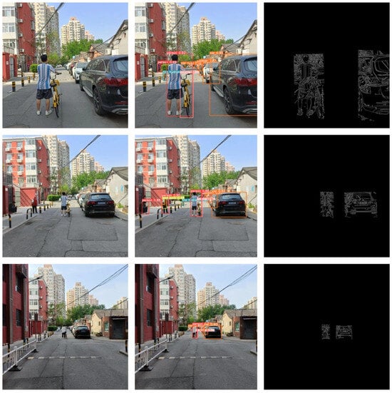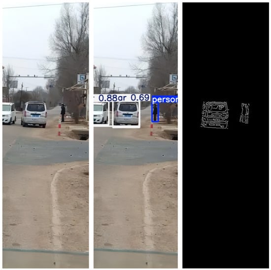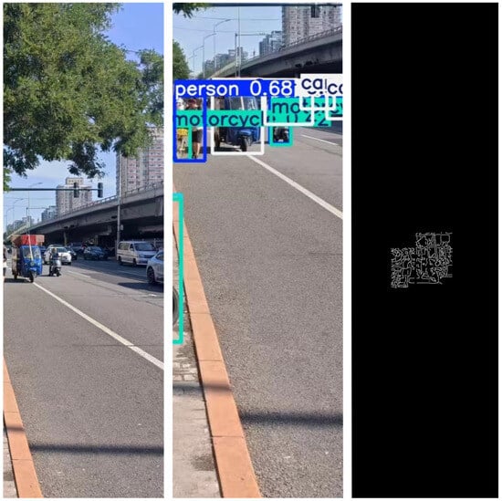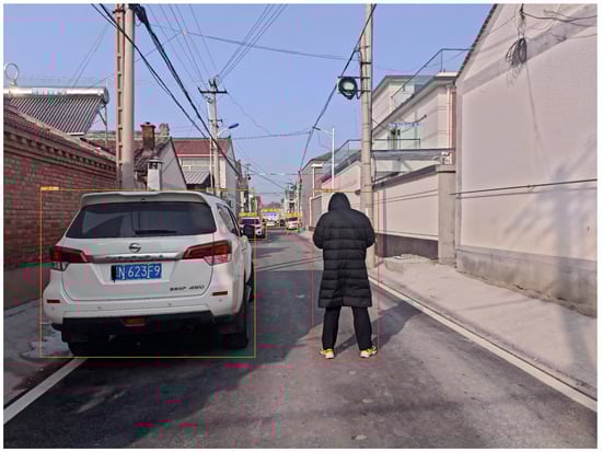 The trained YOLOv5x model was applied to process each frame, detecting and recognizing pedestrians and vehicle targets within it. This enabled us to accurately locate and label the positions of pedestrians and vehicles in the image, as shown in Figure 11.