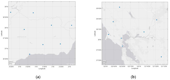 Experiment Area 1 is located in southern Spain, while Experiment Area 2 is situated on the west coast of the United States. Both areas are coastal. (a) Experiment Area 1. (b) Experiment Area 2. The blue dots represent the spatial distribution of stations in the test area.