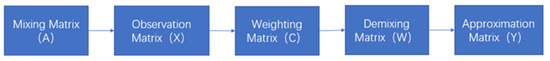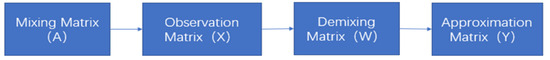Figure 4 illustrates the process of the Independent Component Analysis (ICA) method. The primary objective of ICA is to recover the original source signals, denoted as in Equation (4), from the observed mixed signals. This is achieved by estimating the unmixing matrix , which is the inverse of the mixing matrix . The estimation of is performed through an iterative process, where the matrix is updated progressively until it converges to a stable solution. Once convergence is achieved, the resulting unmixing matrix can be used to separate the mixed signals into their independent components, yielding the approximated source signals represented by the matrix .