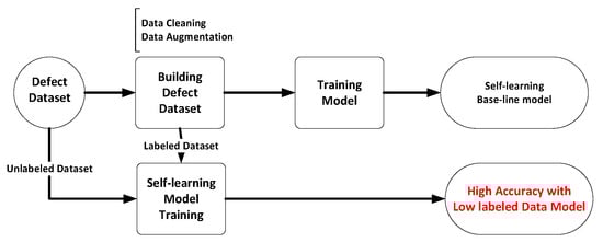 In this study, we focused on developing a robust AOI system starting from the initial stages of the manufacturing process. The proposed approach involved multiple phases, including initial dataset assembly, model development, data augmentation, semi-supervised learning implementation, and thorough evaluation. This comprehensive design aimed to enhance the accuracy of defect detection while minimizing reliance on extensive annotated datasets. The complete process of the proposed method is illustrated in Figure 2, showcasing everything from early data establishment to subsequent model development, which involves creating a foundational dataset and model, validating labeled images, and then integrating both labeled and unlabeled images to establish a self-learning model. This allows us to achieve better results using a minimal amount of labeled data.