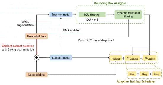 - Adaptive Training Scheduler: To further refine the training process, this scheduler dynamically adjusts the learning rate and other parameters based on the confidence levels of the pseudo-labels generated during training. By doing so, it helps to prevent the model from being misled by unreliable data, which is a common challenge in semi-supervised learning [,,];