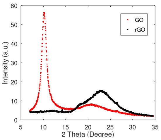 Prior to the reduction process, the GO patch was functionally an insulator, with no or negligible measurable conductivity. After the reduction process, the patch demonstrated finite conductivity, with measurable resistance making it suitable for use as a resistive strain gauge. This change in behavior was attributed to the reduction in the oxygen-containing functional groups [58]. Analysis using X-Ray diffraction (XRD) was performed with a Bruker D8 Discover on samples before and after the reduction process to confirm the production of rGO. As shown in Figure 1, the first peak for the GO appeared at about 10.19°, which can be attributed to the interlayer spacing of about 0.87 nm. Thermal procession caused this peak to disappear, forming a new peak at 22.81°, which corresponded with the interlayer spacing of about 0.39 nm. This decrease in the interlayer spacing can be attributed to the oxygen functional group reduction in GO and is reasonably consistent with the literature indicating a reduction in GO [59,60,61,62].