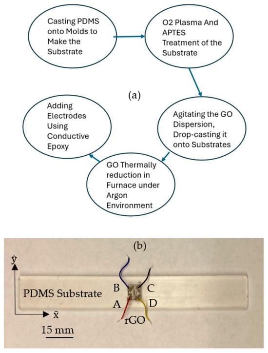The general synthesis procedure of the sample is shown in Figure 2a. As shown in Figure 2b, four electrodes and lead wires were applied to the rGO patch using CircuitWorks 2400 (CHEMTRONICS, Kennesaw, GA 30152, USA) conductive epoxy [63,64] at points A, B, C, and D. It is worth noting that orders of magnitude difference between resistance of electrodes wire and rGO made the piezo-resistivity of the wire negligible.