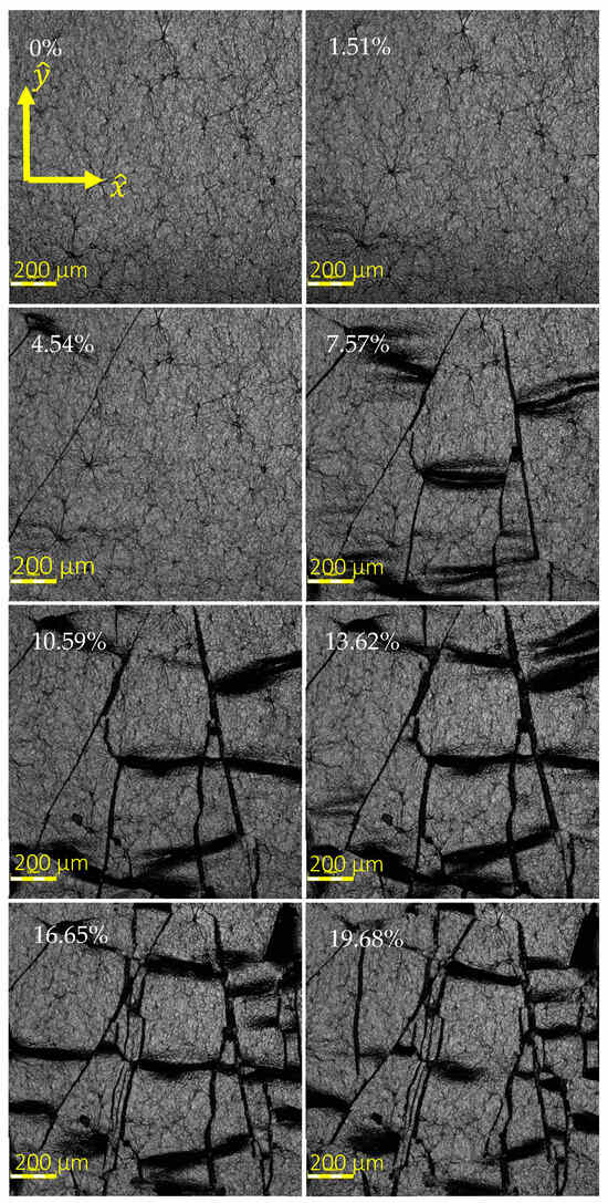 Microscopic inspection, shown in Figure 4, indicates that there was no significant brand-new cracking observed in the rGO at strains less than 7.57%. As can be seen, significant cracking and displacements accumulated at a faster rate, with strains beyond 7.25%. The approximate accumulated length of the visible cracks at 0%, 1.51%, and 4.54% can be manually measured using the scale bar as 0, 0, and 1.64 mm, respectively, whereas at strain of 7.57%, this value increased drastically to the value of 7.62 mm and then increased to 8.74 mm at 10.59% strain. This observation matches the physical mechanism underlying nonlinear percolative-like behavior of the material discussed in Section 3.2. The variation in the strain value at which the nonlinear trend begins can be attributed to the cracks that may occur at the locations of electron paths between electrodes before or after the 7.25% strain is reached.