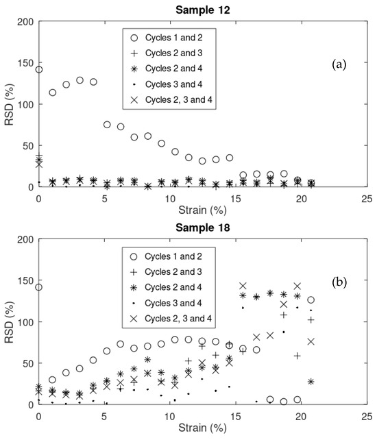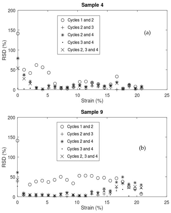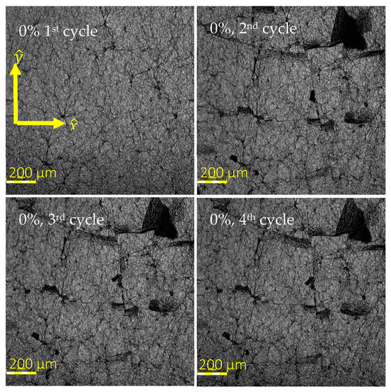 By application of 4 repeated cyclic loads, during the first cycle of strain, formation of cracks was observed in the rGO, explaining the drastic change in behavior. Upon releasing the samples from the first cycle of strain, the cracks tended to close, and the shifted rGO flakes returned to their original location. However, very small gaps between the edges of former cracks remained in place in the size of micro-cracks (Figure 5). Upon subsequent cycling, these residual micro-cracks would open and close, demonstrating a more consistent mechanical behavior, which explains the large shift in RSD between cycle 1 and 2 and stabilization of the RSD value starting from cycle 2 discussed in Section 3.5.