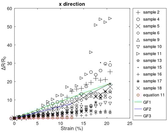 Relative resistance changes in the -direction () can be obtained using Equation (16), where is original resistance in the -direction and can be obtained by setting to zero in Equation (16):