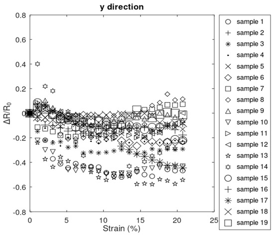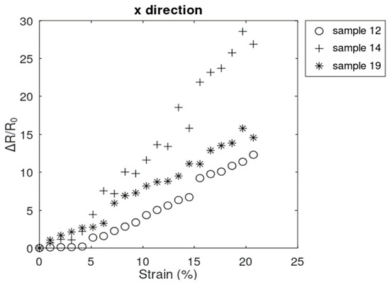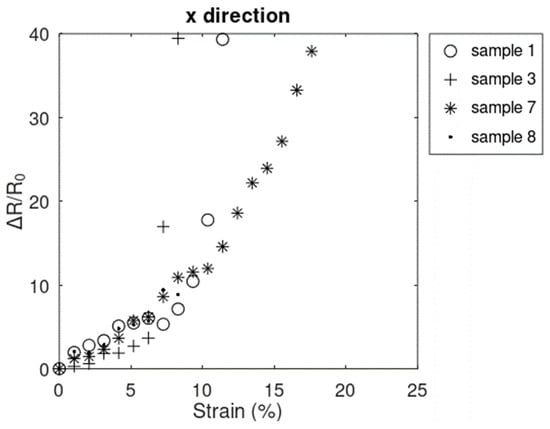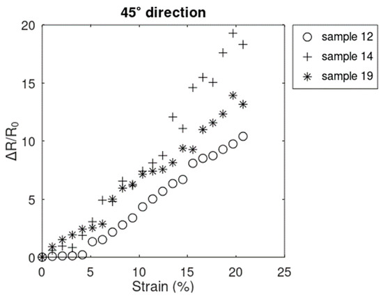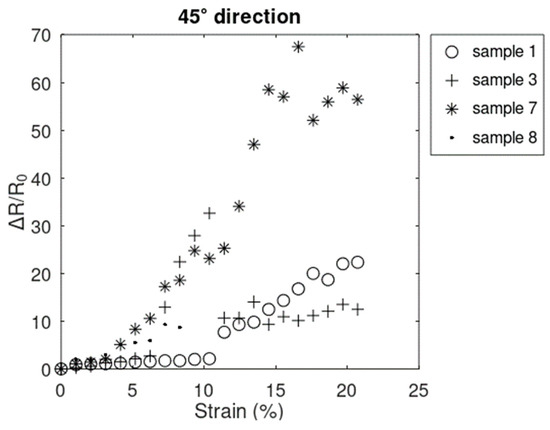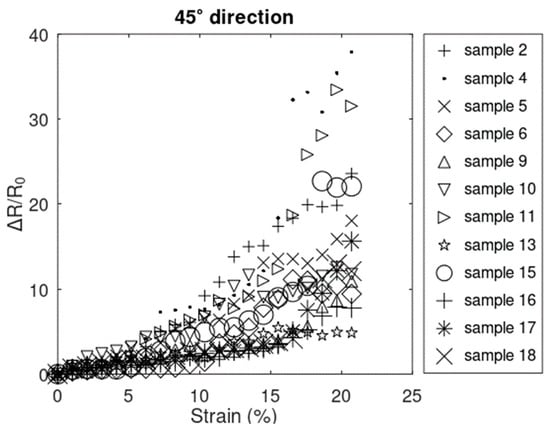 Data collected between points A and C from 15 samples that did not fail before 20.72% showed the same general resistive behavior as in the -direction. The same 12 samples (Figure 10) and 3 samples (Figure 11) showed increasing linear–nonlinear and increasing only-linear behavior, respectively. Looking at the trend in the plot in both groups of samples, the resistive response most closely followed the trends in the -direction rather than the -direction. The smaller magnitude of the resistive response in the 45° direction, with respect to that of -direction, can be explained by the positive values of resistive response in the -direction being offset by the negative values in the -direction. It can also explain the reason why samples generally electrically survived longer in the 45° direction (Figure 12) compared to the -direction (Figure 8).