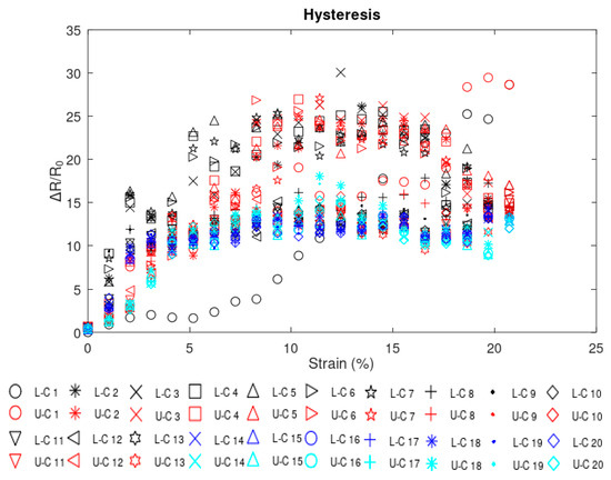 An analysis of the differences in response through multiple loading and unloading cycles was also performed. The hysteresis analysis of the rGO sample is shown in Figure 15, where L-Ci and U-Ci stand for loading cycle number i and unloading cycle number i, respectively. It can be seen from the plot that the shift in the electromechanical response of the sensor between loading and unloading within cycles is small. Additionally, increased consistency in the pattern of the response between different cycles starting from cycle 2 can be observed. The largest change in behavior was observed over the first strain cycle, with an average of 5.6234 Ω/Ω difference between the loading and unloading data points. This initial cycle stabilized behavior in following cycles.