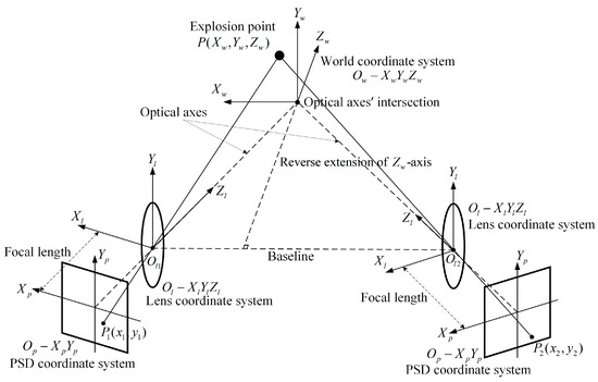 According to Equations (1) and (6), the two devices provide two sets of mathematical relationships between the position information on the PSD and the coordinate of the explosion point in the world coordinate system. Through the least squares method, a set of optimal solutions can be calculated, thus acquiring the coordinate of the explosion point P in the world coordinate system.