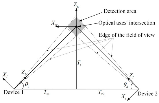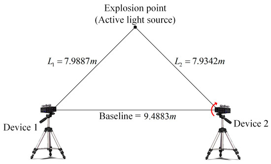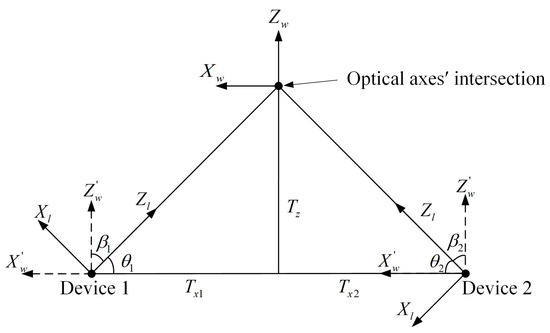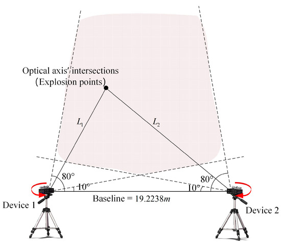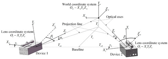 In the figure, and are the azimuth angles of the two devices. and are the angles between the optical axes and the baseline and are complementary to the corresponding azimuth angle. Then, and can be obtained: