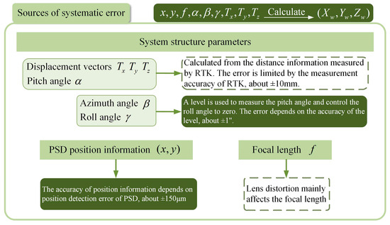 As can be seen from the figure, besides the error optimization of the structural parameters that are the focus of this paper, with respect to the PSD position detection error, due to the electrode structure and the photosensitive surface material of the PSD, there exists a nonlinear interval on the photosensitivity of the PSD, in which the position detection error of the PSD increases. The position detection error can be reduced by the nonlinear correction of the PSD [37]. Additionally, the distortion of the lens will affect the position of the imaging point, resulting in the effective focal length being different from the original focal length of the lens. The effective focal length can be determined by correcting for lens distortion [39,40], which consequently improves the positioning accuracy of the system.