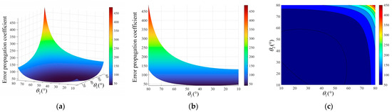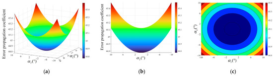 where is the pitch angle of device 1 and is the pitch angle of device 2. Substituting the parameters and Equation (14) into Equation (11), the distribution and variation trend of the overall error propagation coefficient of the system about the pitch angle and in the range of −10° to 10° can be obtained, as shown in Figure 7.