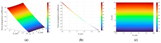 According to the relationship between the detection area and the constructed world coordinate system, analyzing the distribution and variation trend of the error propagation coefficient of and in the range of −20 m to 20 m, Figure 9 is obtained through Equation (11).