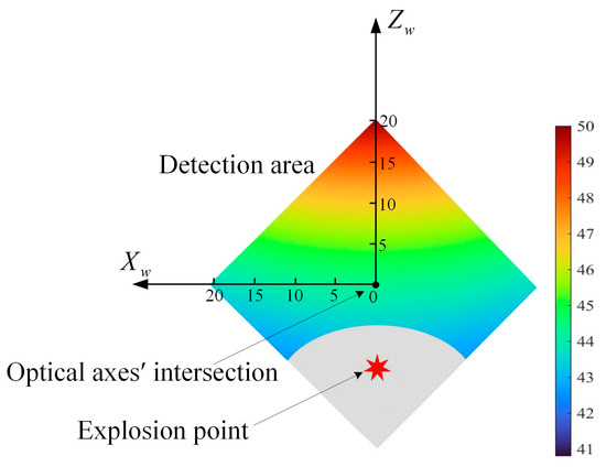 The optical axes’ intersection in the system model is generally in the vicinity of the predicted explosion point, and the system forms the detection area with the optical axes’ intersection point as the center. By simulating the error distribution in the detection area, the area with the highest test accuracy can be found, and the coordinate testing of the system will be more accurate when the explosion points fall in this area. The test accuracy of the system is improved by determining a more optimal position of the optical axes’ intersection.