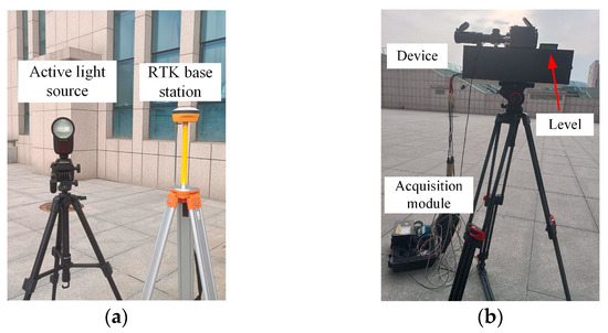 Components of the test system. (a) Active light source and RTK base station; (b) device and acquisition module.