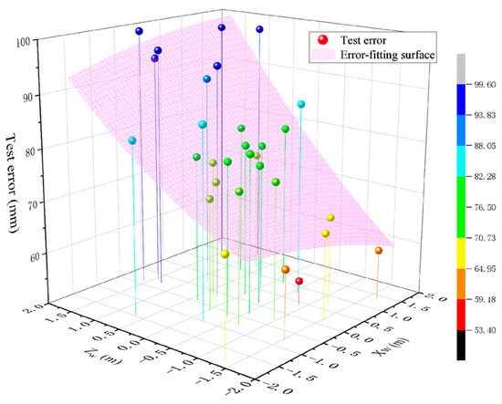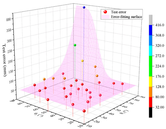 In the figure, the bubble points are the test error of the system when and are taken at different angles, and the pink surface fits the bubble points. The test error decreases gradually as and become smaller, and when and are larger than 50°, the change amplitude of the test error is large, while the variation in the test error is small for less than 50°. Combined with Figure 6 derived from simulation, it can be verified that the system test error is basically consistent with the variation trend of the error propagation coefficient obtained from simulation. The system test error is smaller when and are in the range of 20°–50°, and the system test accuracy is higher with an average test error of 56.17 mm.
