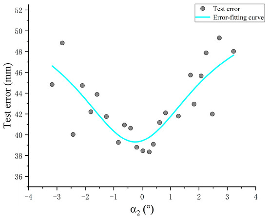 As shown in the table, the pitch angle = −0.303°, changes from −3.168° to 3.219°, corresponding to the variation range of the system test error is 38.35 mm −49.31 mm. The minimum test error for pitch angle is 0.253°, and maximum test error at = 2.719°. The change amplitude of the test error is small. Curve fitting of the data gives Figure 16.