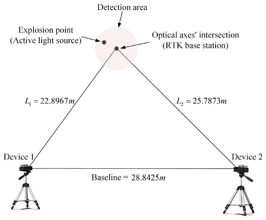 Spatial positioning technology has a wide range of applications in many fields, such as aerospace, military, agriculture, etc. [1,2,3,4], and especially occupies an important position in spacecraft attitude estimation [5,6] and munitions tracking and positioning [7,8,9], as well as robot navigation [10,11,12,13,14]. In recent years, the position testing of the explosion of munitions (hereinafter referred to as the explosion point) has been a hot spot of research, which is a crucial measurement parameter when evaluating munitions. High-precision coordinate testing for the explosion point provides important reference values for the development and effectiveness evaluation of equipment systems [15].