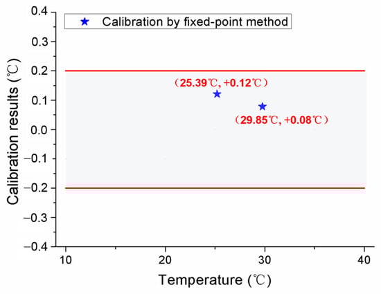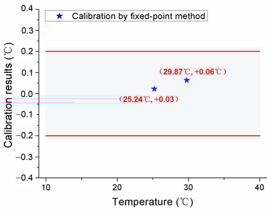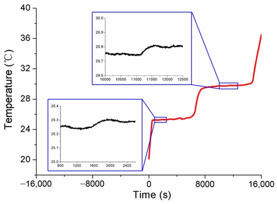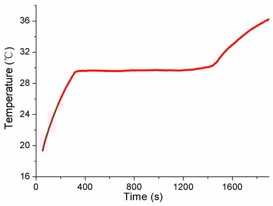 Referring to the application flowchart shown in Figure 1, the three MISSC thermometers listed in Table 1 were initially calibrated by comparison method with a high-precision type T thermocouple from a professional calibration laboratory, both for the fixed points and the temperature sensors. The constant current of 0.06 A was applied to both the No.1 and No.2 fixed points, while 0.08 A was chosen for the No.3 fixed point. The related parameters exploited for the heating control subsystem are presented in Table 2. The results of the three fixed points were presented in Figure 4, Figure 5 and Figure 6, respectively, which were measured by the pre-calibrated temperature testing system with the extended uncertainty of 0.05 °C (k = 2). From the figures, it can be apparently seen that the phase transition temperature plateaus lasted a quite long period, enough to conduct self-calibration, with the temperature changing on a small scale. What should be emphasized is that two-phase transition temperature plateaus for Ga-Zn and Ga fixed points should appear correspondingly. The measured average temperature values of 25.27 °C and 29.77 °C for No.1 fixed points and 25.21 °C and 29.81 °C for No.2 fixed points were determined by calculating the average temperature of the phase transition plateaus, which would be adopted to produce self-calibration for the temperature sensors. However, only one phase transition temperature plateau was presented by Ga solid to liquid transition for the No.3 fixed point, and the reason may be that the Ga-Zn alloy filled in the No.3 MISSC thermometer was in a liquid state at the room temperature of 20 °C due to the supercooling phenomenon. It is a unique phenomenon occurring for some liquid metals, especially for the Ga and Ga-based alloys, which mainly presents the solidification point as sensitive and changing due to several conditions, such as superheating or supercooling the fixed points, non-uniformity of the crystal structure, the effect of heat exchange conditions with the surroundings and so on [15,25,26,27]. A detailed discussion will be given in Section 4.3. Furthermore, the extended uncertainty of six thermocouples used for self-calibration in this paper was pre-calibrated and estimated at 0.2 °C (k = 2), where the uncertainty of the temperature measuring equipment, data recording device and the calibration standard source have been considered, which was carried out by the same professional calibration laboratory.