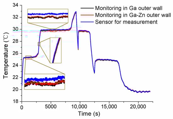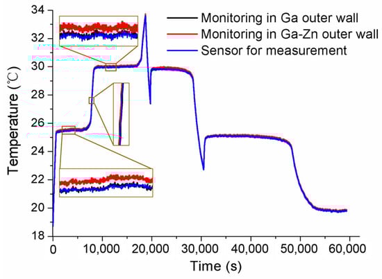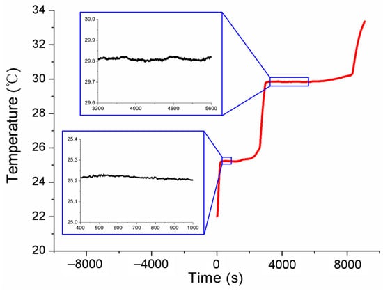 After the initial calibration, self-calibrations were carried out for No.1 and No.2 MISSC thermometers to verify the developed design and calibration method. The main parameters of the heating procedure were the same as those in the initial calibrations. What should be noticed was that the temperature was also measured and collected in the cooling period to ensure and validate that the Ga and Ga-Zn in the MISSC thermometers can solidify in the laboratory at room temperature. For the No.1 MISSC thermometer, the heating started from the temperature of 18.75 °C and lasted for 18,730 s when the temperature reached 33.66 °C and then naturally cooled to the laboratory temperature. During the whole process, three type T thermocouples that had been pre-calibrated, as stated in the initial calibration part, were located in three areas for temperature monitoring/measurement, i.e., the outer wall of the Ga fixed-point cavity, the outer wall of the gallium–zinc alloy fixed point cavity and the sensor mounting block, to illustrate the temperature uniformity of the whole fixed point container, which was demonstrated with the three partly zoomed-in measured temperature curves nearly coinciding, as shown in Figure 7. The average temperature values of melting phase transition plateaus for Ga-Zn and Ga materials in the heating procedure were calculated as 25.39 °C and 29.96 °C, respectively. Then, the self-calibration results could be achieved by making a difference in the average phase transition values from the self-calibration procedure and those from the initial calibration procedure, i.e., Ga-Zn (25.27 °C) and Ga (29.77 °C) solid–liquid phase transition. The errors of 0.12 °C and 0.08 °C were obtained as shown in Figure 8, which were in reasonable agreement with the extended uncertainty level of 0.2 °C of thermocouples. The self-calibration procedure described above was also conducted for the No.2 MISSC thermometer, and similar results were obtained, as shown in Figure 9. The average temperature values of the melting phase transition plateaus for Ga-Zn and Ga materials were 25.23 °C and 29.87 °C, respectively, from which the final self-calibration errors of 0.02 °C and 0.06 °C could be calculated by making comparisons with the initial calibration results of 25.21 °C and 29.81 °C, as shown in Figure 10. From the figures illustrated above, it can be concluded that it was feasible for the developed scheme and system to self-calibrate the temperature sensors with quite high precision.