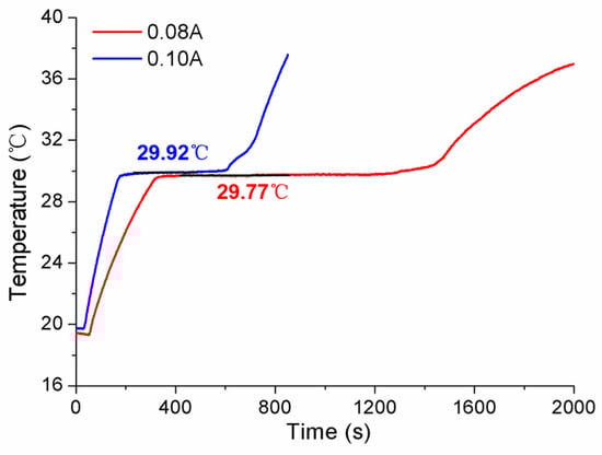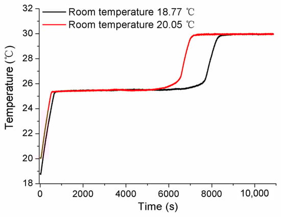 Aiming to discuss the influences of laboratory room temperature and heating power on the self-calibration results, the measured conditions were specially designed, and the experiments were accomplished. Firstly, the measurements were carried out in cases where different room temperatures were set as 18.77 °C and 20.25 °C, respectively. The results obtained in Figure 11 show that the solid–liquid phase transition temperature is almost same for both Ga-Zn and Ga fixed points, only with some difference in the duration of the phase transition plateaus. Secondly, various conditions of heating power were studied by changing the applied different current values. The constant currents of 0.08 A and 0.10 A were chosen to conduct the measurements. The tested temperature curve was plotted in Figure 12, where it can be seen that the phase transition duration decreased significantly, and the temperature values changed to a certain extent. Therefore, it suggests that the heating power should be assigned to the unique MISSC thermometer during the whole service period, i.e., both for the initial calibration and self-calibration. Finally, a specially designed experiment verified that the reason that there was no appearance of Ga-Zn phase transition plateaus during the heating procedure for No.3 MISSC thermometer was super cooling. The main procedure could be described as “5 °C cooling->room temperature->heating->room temperature cooling” and the temperature history curve was plotted as shown in Figure 13. It can be noted that the liquid–solid phase transition began at the container temperature of 10 °C, with the plateaus lasting about 800 s, then the MISSC thermometer cooled to 5 °C. After that, the MISSC thermometer was placed in the conventional laboratory environment (19.7 °C) for 720 s, and the heating current was applied to the resistance film to raise the temperature to 35.5 °C of the fixed point. As can be expected, the two stages of the solid–liquid phase transition plateaus were presented for Ga-Zn and Ga materials. During the room temperature cooling procedure, just the Ga liquid–solid phase transition was achieved. The results testified to the assumption of the supercooling phenomenon of the No.3 MISSC thermometer, thus it cannot be adopted to calibrate the temperature sensor at 25.20 °C with the Ga-Zn fixed point.