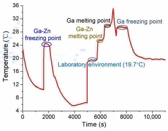 - Ivanova, A.G.; Gerasimov, S.F. The dependence of the phase transition temperature of Ga-Zn eutectic alloy on its morphology. Meas. Tech. 2009, 52, 52–56. [Google Scholar] [CrossRef]