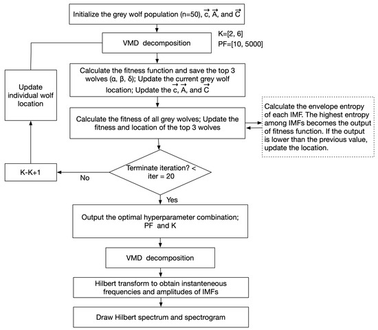 In the original VMD method, users need to provide the number of K modes and the PF in advance, although there is no guarantee whether these parameters are optimal or whether they will achieve satisfactory results [21,22]. The smaller the PF, the larger the bandwidth of each IMF component. Furthermore, improper selection of the number of K modes can directly lead to signaling component distortion and unrealistic denoising effects. In practice, the two influencing parameters are usually difficult to determine because the actual signal to be analyzed is complex and changeable. Thus, selecting suitable parameters is key to the VMD method. Next, we introduce the principle of the GWO algorithm (Figure 1) and its convergence and the steps of the parameter-optimized VMD method.
