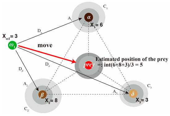 Position updating algorithm for the wolves in the grey wolf optimizer. Three leader/subleader wolves, α, β, and δ, surround the prey, and the position of the prey is inferred from the positions of these three leader wolves, assuming that they surround it. Vectors A and C are coefficient vectors and are calculated for each coordinate. The other wolves in the pack, ω, locate the leader wolves’ positions, which are initially adjusted with a coefficient C and then gradually adjusted in each loop to better approximate the leader wolves’ positions. A random coefficient D is then applied to their distance, allowing them to approach the leader wolves within a range of −1 to +1. As a result, wolves that are closer to the prey than the leader wolves may replace them as the new leaders, enabling the pack to surround the prey more closely. The algorithm specifies three leader wolves and divides the obtained average position by the number of leaders. If the positions of α, β, and δ are 6, 8, and 3, respectively, then the position of the prey would be the midpoint, calculated as (6 + 8 + 3)/3 = 5.7, and the integer 5 becomes the updated position for the prey. The new position of the ω1 wolf is adjusted according to the leaders’ positions, taking into account its current position.