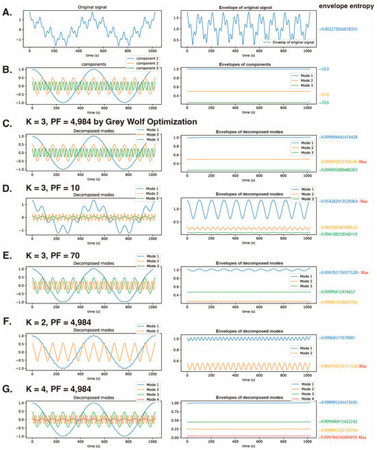 where t = [1/1024, 2/1024, …, 1024/1024] (Figure 3A, left). Here, we used this synthetic function to demonstrate an example of the GWO algorithm being used to optimize K and PF. The envelope entropy of this synthetic function was −9.9767506 (Figure 3A, right). If this synthetic function is decomposed with maximum efficiency, it should result in decomposition into cosine waves , , and (Figure 3B, left). Each envelope of the efficiently decomposed components will become a flat line, and the envelope entropy will be −10.0 (Figure 3B, right). This trigonometric function’s composite waveform was analyzed using the GWO algorithm with 20 wolves and 20 iterations, setting K to range from 2 to 6 and PF from 10 to 5000 (randomization in increments of 1 for K and 1 for PF). The envelope entropy of each IMF was calculated, and K and PF were optimized using both the mean value method and the maximum value method. As a result, the GWO algorithm determined the optimal values of K = 3 and PF = 4984. The envelope entropies of the three IMFs were −9.9999944, −9.9999929 (max), and −9.9999958 (Figure 3C). With settings of K = 3 and PF = 10 (Figure 3D) or K = 3 and PF = 70 (Figure 3E), the IMFs were superimposed on the other cosine waves, indicating that complete frequency separation was not achieved.