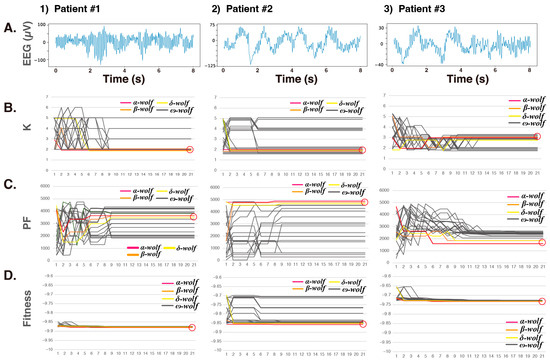 Next, for the three cases of GA induced by continuous intravenous propofol administration, the optimal solutions for K and PF were determined through fitness function optimization using the GWO algorithm (20 wolves, 20 optimization loops) for all 73 epochs during the 10 min before and after awakening from GA. Each epoch of EEG data lasted 8 s (128 Hz, 1024 data points).