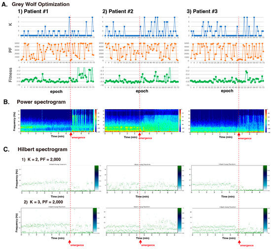 Grey wolf optimization in the VMD of EEGs obtained from three patients of GA induced by continuous intravenous propofol. (A) The optimal solutions for K and PF were determined through fitness function optimization using the GWO algorithm. Twenty wolves and 20 optimization loops for all 73 epochs. Each epoch lasted for 8 s (128 Hz, 1024 data points) of the 10-minute period before and after awakening from GA. Additionally, K was set in the range of 2 to 6 (in increments of 1), and the PF values ranged from 10 to 5000 (in increments of 10). (B) The spectrogram for the 10-minute interval was obtained using the multitaper method and is displayed in Figure 4B. (C) Using VMD with K = 2 or 3 and PF = 2000, the signal was decomposed into IMFs and a Hilbert spectrogram was obtained. The gradient color bar shows the relative power value of the signal. K: decomposition number; PF: penalty factor; fitness: fitness value of VMD = the maximum envelope entropy of the IMF.