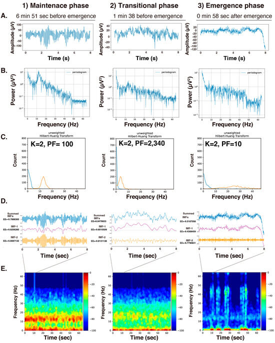 Finally, we applied the analysis to 8 s EEG segments during the (1) maintenance, (2) transition, and (3) emergence phases of GA induced by propofol (Figure 6A). The power spectrum obtained through Fourier analysis is shown in Figure 6B. The analysis was conducted with 20 wolves, 20 repetitions, and settings of K = 2 to 6 (in increments of 1) and PF = 10 to 5000 (in increments of 10). The results show a convergence to K = 2 for the 8 s EEG in all three phases. Figure 6C presents the Hilbert spectrum, and Figure 6D shows the IMFs of the EEG after applying VMD with the optimized K and PF values. The Fourier spectrogram (multitaper method) for 64 s, including the aforementioned 8 s EEG segment, is shown in Figure 6E. While IMF-1 was almost fixed in the delta wave region, the peak values of the Hilbert spectrum for IMF-2 showed variation across the phases of GA. IMF-2 showed enhanced α waves at approximately 10–12 Hz under propofol-induced GA, as shown in Figure 6E, and shifted forward and backward with the transition to emergence from anesthesia.