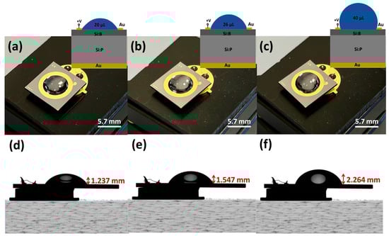A photographic view of the 1 × 1 cm2 impedance chip wire-bonded to a TO-39 package is presented in Figure 1. Additionally, various liquid volumes of 20 µL, 26 µL, and 40 µL inside the ring electrode are also shown in Figure 1a, Figure 1b and Figure 1c, respectively. To ensure a uniform distribution of the electric field, the liquid within the ring electrode is consistently maintained in contact with the electrode. The height of the liquid for the initial addition of 20 µL inside the ring electrode is measured to be 1.24 mm (Figure 1d), for 26 µL, it is 1.55 mm (Figure 1e), and for 40 µL, it is 2.26 mm (Figure 1f). Recalculating the volume using the height of the liquid drop and the diameter of the inner ring electrode via the ellipsoidal volume equation results in an error margin of ±1 µL for the total volume inside the ring electrode. Given that the height of the liquid is significantly greater than the 150 nm thickness of the gold ring electrode, it is crucial to maintain the defined contact angle of the silicon surface to prevent overflow without losing the sensitivity of the silicon surface to the introduced liquid to its surface.