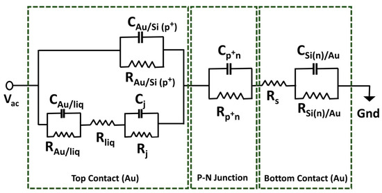 Figure 2 demonstrates the equivalent circuit model with capacitance and resistance pairs, which is used to model the small changes in the impedance measurement of the filled impedance chip due to the change in volume, dilution, and pH. The proposed equivalent circuit is based on the geometry of the impedance chip, which is segmented into three blocks. The capacitance CSi(n)/Au and resistance RSi(n)/Au pair in the rightmost block represent the depletion region at the junction of the bottom gold contact and the phosphorus-doped silicon (n-Si) bulk. The depletion region formed at the p–n junction after the implantation of the boron(B+) ions is represented by the capacitor Cp+n and resistor Rp+n. The leftmost block represents the depletion formed at the impedance chip surface between the gold ring electrode, filled buffer, and the silicon (Si(p+)) surface. The Schottky contact formed between the metal and semiconductor is represented by the parallel combination of a capacitor and a resistor. The top part of the leftmost circuit block includes a parallel combination of the capacitor CAu/Si(p+), which represents the capacitance of the depletion region, and a resistor RAu/Si(p+), which represents the potential leakage path between the gold ring electrode and the Si(p+) surface under the gold ring electrode. In the bottom part of the circuit block, there are two capacitance and resistance pairs. An electric double-layer formation between the gold electrode metal and the filled buffer liquid is represented by the parallel combination of CAu/liq, which represents the double-layer capacitance, and RAu/liq, which represents the charge transfer resistance at the liquid–gold ring electrode junction. The second pair Cj and Rj represent the space charge region between the native silicon dioxide and Si(p+) surface, and Rliq represents the bulk resistance of buffer liquid in contact with the Si(p+) surface. The series connection of two capacitance and resistance pairs of the bottom part of the circuit block gives the cumulative impedance of the interaction at the interface between the gold ring electrode, the buffer liquid, and the p-doped silicon (Si(p+)) surface.