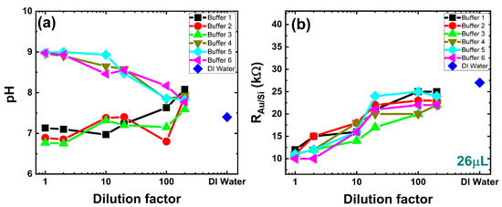 In Figure 3a, the selected three buffer test solutions (Buffer 1, 2, and 3) above the physiological pH and three buffer test solutions (Buffer 4, 5, and 6) selected below the physiological pH show the change in pH with the increasing dilution. The pH of the first three test buffers increases gradually with the dilution, with an offset for buffer test solution 2 at a dilution factor of 100 toward the DI water pH, whereas the other three buffers’ pH decreases slightly until a dilution factor of 10 and steeply toward the DI water pH with further dilution. The parameter RAu/Si shows linear change with the dilution on the logarithmic scale, as illustrated in Figure 3b.