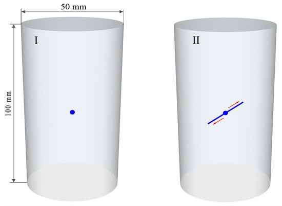 The bulk sandstone samples collected in the field were transported to the laboratory for preparation. The sandstone specimens were prepared following the guidelines provided by the International Society for Rock Mechanics (ISRM) [28]. The specimens were then processed into standard cylindrical forms, with a diameter of 50 mm and a height of 100 mm. The specific preparation process is shown in Figure 1. Subsequently, based on the intact sandstone obtained from the above preparation, sandstone specimens with different prefabricated fracture geometry parameters were further prepared by a mechanical cutting method. A 3 mm diameter diamond drill was used to drill a hole in the center of the intact specimen at the position shown in state I in Figure 2. A circular hole of 3 mm front-to-back through type was formed along the diameter direction of the specimen. Then, a diamond corded saw was passed through the small hole and cut back and forth along the pre-designed direction of fissure distribution until a fissured sandstone specimen was completely produced as shown in state II in Figure 2. It has been experimentally verified that the water-saturated specimens require immersion of the natural specimens in water for 45 days to be obtained. Finally, single-fissured sandstone specimens were obtained for uniaxial compression testing under natural and water-saturated conditions. The length of the fissure was 10 mm, the width was 1.5 mm, and the angle was 45°.