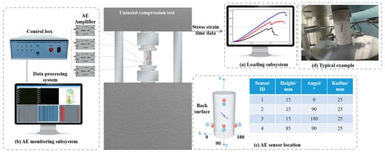 The test system’s schematic diagram layout. (a) Loading subsystem. (b) AE monitoring subsystem. (c) AE sensor location. (d) Typical example.