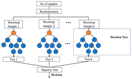 Breiman proposed the Random Forest (RF) algorithm for classification and regression [31,32]. Similar to AdaBoost, RF is also an ensemble learning method. In the case of solving classification problems, the Random Forest algorithm determines its output by taking the mode of the outcomes from multiple decision trees. Thus, RF can be considered a classifier consisting of numerous decision trees. The key steps in implementing Random Forest include bootstrap sampling, random feature selection, construction of decision trees, and ensemble method selection [31]. During the process of random sampling, bootstrap sampling is employed to randomly select samples from the training set. As this introduces randomness into the data, each decision tree’s training set becomes unique. Figure 4 shows the implementation principle of the RF.