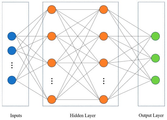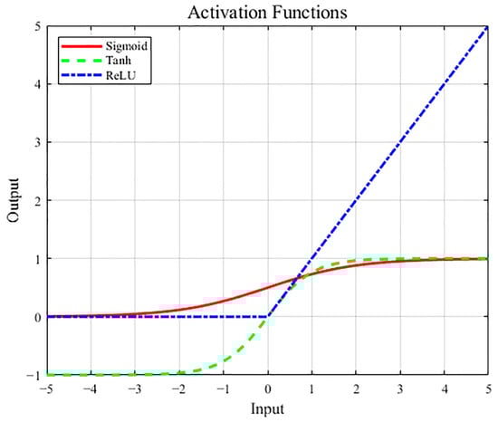 The principle of deep learning neural networks aims to mimic the structure and functionality of biological neural networks. It employs mechanisms and methods akin to those found in nature for transmitting and processing feature neural signals, thereby achieving classification outputs for new samples [33]. The Multilayer Perceptron (MLP) is a feedforward neural network model consisting of multiple neurons, which includes an input layer, several hidden layers, and an output layer. In this model, each neuron receives the output from the preceding layer of neurons and undergoes a nonlinear transformation through an activation function before transmitting the result to the subsequent neuronal layer [33,34]. The feedforward propagation of MLP enables it to effectively solve intricate nonlinear problems, as depicted in Figure 5 for the implementation principle of MLP. The hyperparameters associated with hidden layers, including the number of hidden layers, the neural unit count within each hidden layer, and the choice of activation function [33,35], can be adjusted. The prediction outcomes of the MLP model can generally be enhanced by increasing the number of hidden layers and neural units within each layer. However, there exists an upper threshold beyond which further improvement in prediction accuracy is no longer observed. The activation function plays a crucial role in introducing nonlinear operations to both hidden and output layers, thereby enhancing the complexity and expressiveness of the neural network’s output. The selection of an appropriate activation function should be based on data characteristics. Three commonly employed activation functions include sigmoid, tanh, and ReLU [36]. Detailed principles for these three activation functions are illustrated in Figure 6.