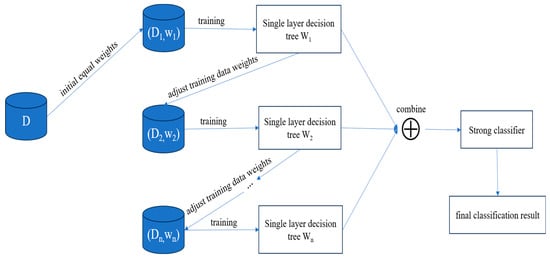 AdaBoost is a typical ensemble learning algorithm proposed by Freund [37,38]. The core idea of ensemble learning is to combine the judgments and opinions of multiple models to minimize the inaccuracy of a single model and produce more stable outcomes across various situations. The primary principle of AdaBoost involves training multiple weak classifiers. This process iteratively updates the weights of subsequent classifiers based on the previous classification results using the same training set. Strong classifiers are synthesized according to the weights assigned to each weak classifier upon the completion of each iteration. Finally, the final weak classifiers are fused into a final strong classifier for binary or multiple classification problems [39]. Figure 7 depicts the implementation principle of AdaBoost.