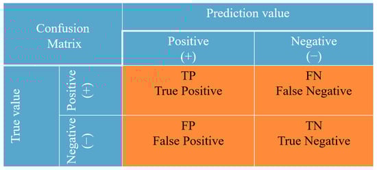 In early warning models for fissured sandstone instability, it is crucial to assess the performance of these models. To validate the performance of the three machine learning models, five validation metrics suitable for classification issues were selected, namely confusion matrix, accuracy, precision, recall, and F1 score [40,41,42]. The identification results of fissured sandstone risk states were visualized using a confusion matrix. In the context of a standard binary classification problem, the confusion matrix is represented as a 2 × 2 matrix with four possible outcomes [43,44], as shown in Figure 8. The confusion matrix employed in this study for identifying the risk state of fissured sandstone is a 3 × 3 matrix, as shown in Table 1. Each column represents the predicted failure state, while each row corresponds to the true failure state of the data [45].
