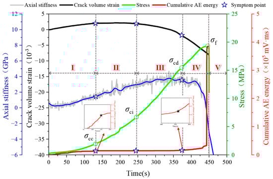Stage II: Elastic deformation stage. The stress–strain curve exhibited a linear relationship. During this stage, the applied stress was insufficient to initiate new cracks or propagate existing ones. Consequently, the crack volume strain curve followed a consistent and steady trajectory with minimal AE activities observed. The cumulative AE energy curve remained stable throughout this period. The demarcation point between stage II and stage III, occurring just before the subsequent peak, represents the crack initiation stress, σci.