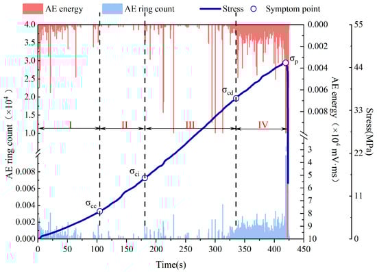 Stage IV: Accelerated crack growth stage. A concave trend was observed in the stress–strain curve, indicating the initiation of yielding and deformation in the specimen. The expansion and merging of internal microcracks formed a network, resulting in the occurrence of the stress drop phenomenon. Concurrently, high-energy AE events were detected, leading to a steep increase in the cumulative AE energy curve. Subsequently, the peak strength σf, representing the maximum applied stress level, was attained.