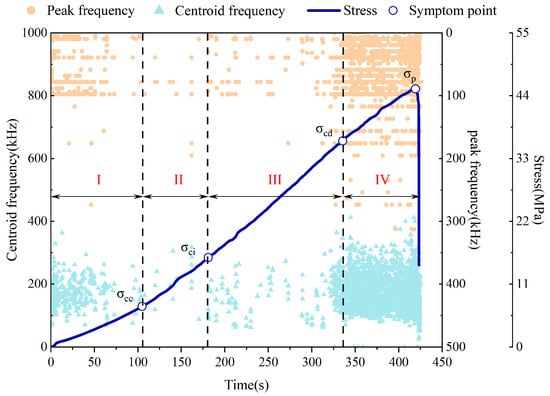 Both centroid frequency and peak frequency are crucial characteristic parameters for characterizing the nature of the rupture source [10]. The former quantifies the proportion of high-frequency energy, while the latter is commonly employed to typify the type of rupture source. These two parameters can be effectively utilized to discern alterations in the internal conditions of fissured sandstone. The results presented in Figure 11 demonstrate that during the initial loading phase, the internal fracture form of fissured sandstone was predominantly characterized by original microcrack compaction. During this stage, small-scale and low-frequency AE signals were found to be dominant, while medium–high-frequency signals were rarely observed. As the crack growth occurred within the fissured sandstone, the AE signals reverted to exhibiting characteristics of small-scale and low-frequency events. Subsequently, upon entering stage III, there was a noticeable intensification in both medium- and high-frequency signals. Furthermore, with continued loading, there was a significant increase in the proportion of medium- and high-frequency signals detected. Consequently, it can be inferred that the emergence of medium- and high-frequency signals serves as precursor information for accelerated crack propagation within fissured sandstone.