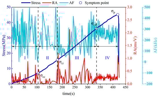 The Rise Angle (RA) value is the ratio of rise time (RT) to amplitude (A). The Average Frequency (AF) value stands for Average Frequency, which is the ratio of the event frequency of the acoustic emission signal to the ring-down count (RC). The combined use of RA and AF values provides a more comprehensive analysis of crack propagation behavior in materials or structures. The evolution pattern of RA and AF values with time during the fissured sandstone damage process is presented in Figure 12. It can be observed from Figure 12 that both the RA value and AF value exhibited an overall fluctuating trend over time. Initially, during the loading phase, both values underwent fluctuations at a certain level. Subsequently, as stable crack growth occurred before reaching the peak, it is noted that the AF value started to increase while the RA value remained low and changed smoothly. Upon reaching the crack damage stress point, there was a significant flattening of fluctuations in both the RA value and the AF value, accompanied by a decrease in AF value fluctuation and an increase in RA value fluctuation. This phenomenon can be considered as characteristic of stage III—“fluctuating increase of AF value and low-steady change of RA value”. The inclination towards decreased fluctuation in AF value along with an increased rise in RA value can serve as early indicators for accelerated crack growth.