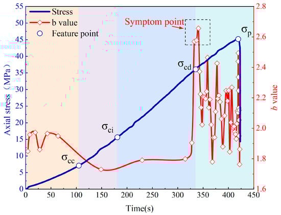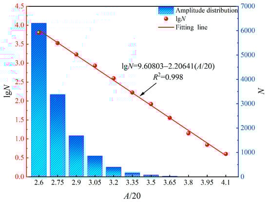 The AE b value is an indicator of the microfracture scale within a brittle rock body. It can reflect the evolution of microcracks during the damage process [46]. A decrease in the b value typically indicates a reduction in low-amplitude AE events associated with microfractures. Conversely, an increase in high-amplitude AE events suggests significant rupture. When the b value fluctuates within a certain range, it signifies stable rock body rupture occurrence. However, a sharp decline in the b value over a short period implies a sudden increase in large fracture events and accelerated crack propagation, potentially leading to instability failure [47]. Originally proposed based on the earthquake frequency–magnitude relationship in seismology, the AE b value calculation replaces seismic magnitude with AE amplitude after reducing it by 20 times to match magnitude values. Equation (5) presents the calculation formula for determining the AE b value.