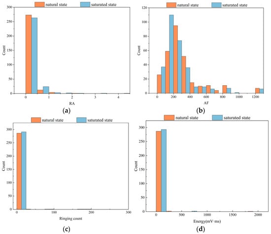 Distribution histograms serve as a visual tool for illustrating the distribution of numerical data, playing a vital role in data analysis by depicting the overall form and dispersion of a dataset. Hence, histograms were created to visualize the above dataset. This can help us better understand the internal distribution of data. While observing the distribution of the data, it is possible to understand the statistical differences in the features and obtain a side-by-side explanation of the feasibility of a feature being used as a machine learning input feature. Two perspectives were chosen to analyze the distribution of each parameter in the dataset. One was the distribution of each parameter in the natural and saturated states. The other was the distribution of each parameter in three different risk states for damage destruction of fissured sandstone.