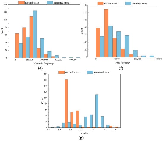 Distribution of AE parameters for damage processes in fissured sandstones under natural and saturated states. (a) RA. (b) AF. (c) Ringing count. (d) Energy (mV·ms). (e) Centroid frequency. (f) Peak frequency. (g) b value.