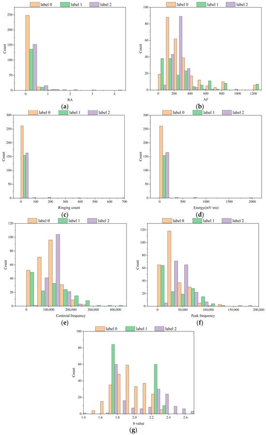 Similar to the analysis above, as shown in Figure 16, the overall statistical trends of individual precursor information were consistent in the natural and saturated states. Label 0, Label 1, and Label 2 represent no instability risk state, medium instability risk state, and high instability risk state, respectively. We take the b value as an example: The b value of the no instability risk state ranged from 1.4 to 2.4, and the center of gravity was around 1.9. The b value in the medium instability risk state was mainly concentrated at 1.8 and 2.3, with a small distribution in the range of 1.8 to 2.3. The b value for the high instability risk state was distributed between 1.8 and 2.7, and the data were more dispersed than those in the remaining two states. Once again, the selected precursor information indicators were justified.