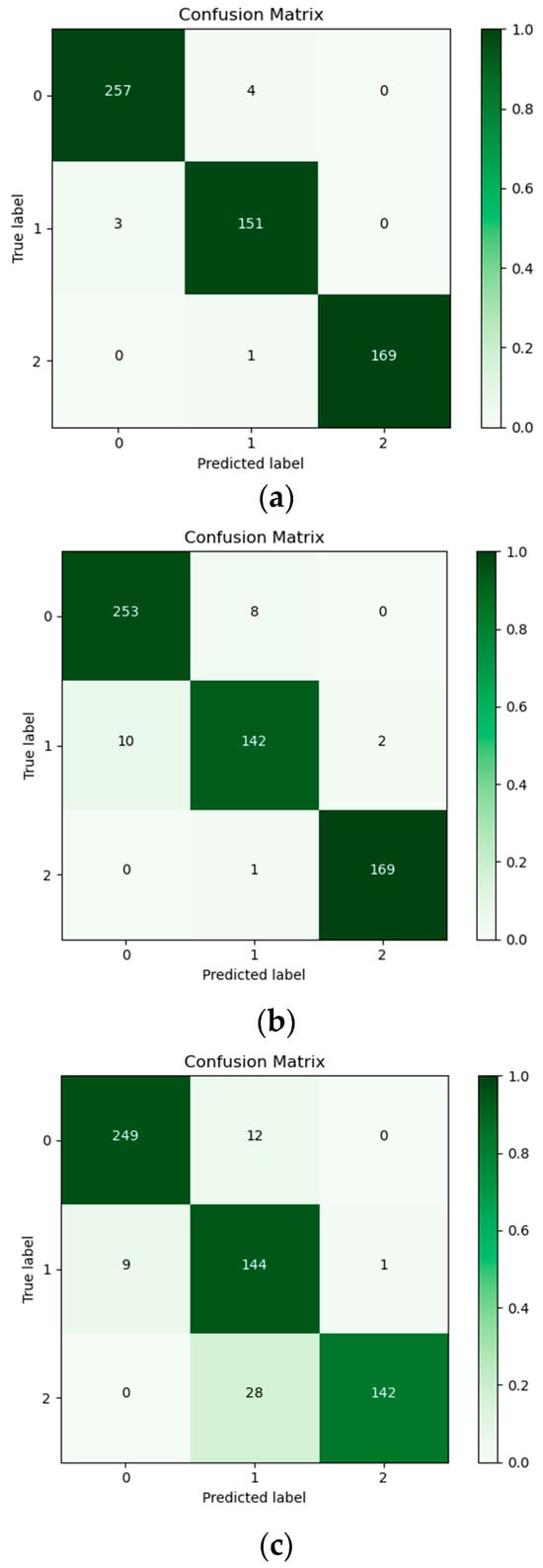 The confusion matrices of three distinct models for identifying instability in fissured sandstone. (a) Random Forest. (b) MLP. (c) AdaBoost.